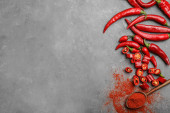 Miska mielonej czerwonej papryki ze składnikami na szarym stole, płaska leżanka. Miejsce na tekst