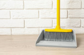 Miotła z tworzywa sztucznego z patelnią na drewnianej podłodze wewnątrz