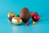 Easter chocolate bunny i kolorowe jajka izolowane na białym tle. Przestrzeń kopiowania