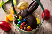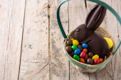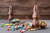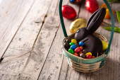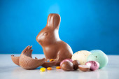 Wielkanocny królik czekoladowy i kolorowe jajka na drewnianym stole i niebieskim tle. Przestrzeń kopiowania