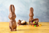 Zdjęcie "Wielkanocny królik czekoladowy i kolorowe jajka na drewnianym stole i niebieskim tle. Przestrzeń kopiowania" może być wykorzystywane do celów osobistych i komercyjnych zgodnie z warunkami zakupionej licencji Royalty-free. Obraz jest dostępny do pobrania w jakości wysokiej rozdzielczości do 5760x3840.