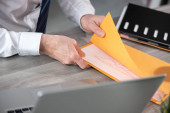 Adwokat czyta dokumenty korporacyjne patrząc notatnik wyszukiwania informacji w biurze.