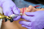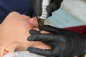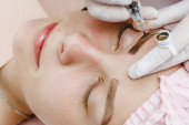 Kosmetolog nakładający stały makijaż na brwi Selektywne skupienie i płytka Głębokość pola.Mikrobleyding brwi workflow w salonie kosmetycznym