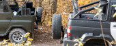 Para dwóch starych retro rocznika 4x4 radziecki SUV pojazdu na brud żwiru nieutwardzonej drogi w lecie o zachodzie słońca rano. Off road samochód góry safari przygoda natura podróż koncepcja podróży. Wynajem quadów .
