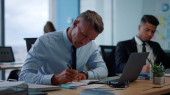 Formularz wypełniania dokumentu Ceo w biurze z partnerem biznesowym. Człowiek ręka pisać papier.