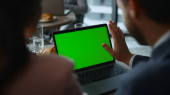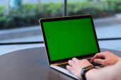 Człowiek ręce wpisując klawiatury laptop zielony ekran w kawiarni stół restauracja.