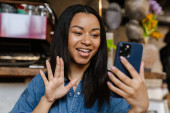 Czarna uśmiechnięta kobieta gestykulująca podczas rozmowy wideo w kawiarni