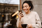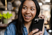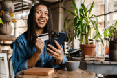 Zdjęcie "Czarna uśmiechnięta kobieta korzystająca z telefonu komórkowego i karty kredytowej podczas siedzenia w kawiarni" może być wykorzystywane do celów osobistych i komercyjnych zgodnie z warunkami zakupionej licencji Royalty-free. Obraz jest dostępny do pobrania w jakości wysokiej rozdzielczości do 5760x3840.