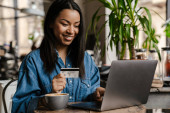 Czarna uśmiechnięta kobieta korzystająca z telefonu komórkowego i karty kredytowej podczas siedzenia w kawiarni