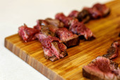 Kawałek wołowiny jest smażony na patelni.