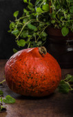 Jesienna koncepcja gotowania żywności. Dyniowy puree, całe i pokrojone dynie. Tradycyjny symbol upadku, kamienne tło, zbliżenie