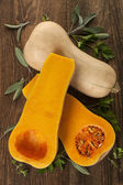 Połówki surowej dyni z puree z dyni, miodu i świeżych ziół. Składniki asortymentu do gotowania, tło z betonu kamiennego, widok z góry