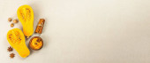 Połowa surowej dyni z puree z dyni i przyprawami. Składniki asortymentu do gotowania, tło z betonu kamiennego, widok z góry