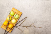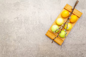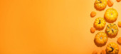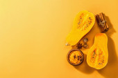 Połowa surowej dyni z puree z dyni i przyprawami. Składniki asortymentu do gotowania, jasnopomarańczowe tło, twarde światło, ciemny cień, format banera