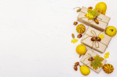 Połowa surowej dyni z puree z dyni i przyprawami. Składniki asortymentu do gotowania, tło z betonu kamiennego, widok z góry