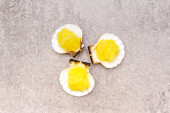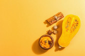 Połówki dyni z orzechami z przyprawami. Tradycyjne jesienne składniki do gotowania, pomarańczowe tło, twarde światło, ciemny cień, widok z góry