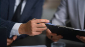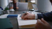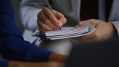 Prawnicy piszą notatki wypełniając dokumenty w biurze spotkań biznesowych.