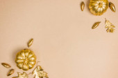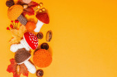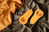 Połówki dyni z orzechami z przyprawami. Tradycyjne jesienne składniki do gotowania, pomarańczowe tło, twarde światło, ciemny cień, widok z góry