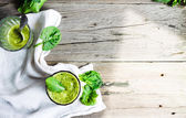 Jarred Kelp przecier. Zdrowe superjedzenie z wodorostów oceanicznych. Składnik na koktajle, zupy, sosy i dipy. Turkusowe drewniane deski tło, widok z góry