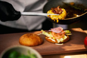 Dodawanie czerwonej cebuli do burgera w profesjonalnej kuchni.