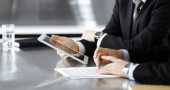 Biznesmen ręcznego pisania dokumentu analizującego raport korporacyjny w biurze firmy.