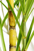 Trzcina cukrowa wiązana na białym drewnianym tle, miejsce na tekst, zbliżenie. Widok z góry.