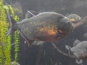 Czerwony brzuch piranii w zbliżeniu, kolorowe błyszczące tropikalne ryby w kolorach złota, pomarańczowy i czerwony. Zbliżenie. Skupienie selektywne
