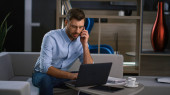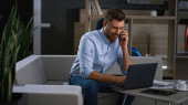 Zdjęcie "Uśmiechnięty biznesmen rozmawiający telefon przeglądać tablet urządzenia surfowania w sieci w miejscu pracy." może być wykorzystywane do celów osobistych i komercyjnych zgodnie z warunkami zakupionej licencji Royalty-free. Obraz jest dostępny do pobrania w jakości wysokiej rozdzielczości do 5760x3840.