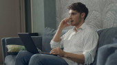 Uśmiechnięty biznesmen rozmawiający telefon przeglądać tablet urządzenia surfowania w sieci w miejscu pracy.