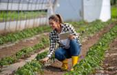 Zdjęcie "Ładny młody rolnik trzyma tabletkę i przysiada na plantacji pomidorów w zielonym domu" może być wykorzystywane do celów osobistych i komercyjnych zgodnie z warunkami zakupionej licencji Royalty-free. Obraz jest dostępny do pobrania w jakości wysokiej rozdzielczości do 5760x3840.