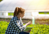 Ładny młody rolnik trzyma tabletkę i przysiada na plantacji pomidorów w zielonym domu