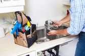 Mężczyzna myje naczynia detergentem i gąbką pod bieżącą czystą wodą w zlewie w domu. Styl życia