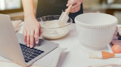 Zdjęcie "Słodka nastolatka patrzy przez laptopa na lekcję online i przygotowuje ciasto do pieczenia" może być wykorzystywane do celów osobistych i komercyjnych zgodnie z warunkami zakupionej licencji Royalty-free. Obraz jest dostępny do pobrania w jakości wysokiej rozdzielczości do 5760x3840.