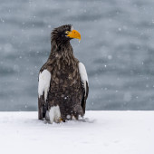 Łysy orzeł siedzący na brzegu jeziora Michigan