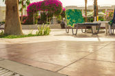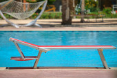 Puste leżaki pod słomkowymi parasolami od strony basenu i kosz na śmieci do usuwania śmieci w tropikalnym kurorcie. Wakacje letnie i koncepcja ucieczki