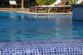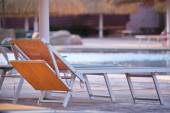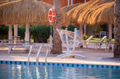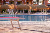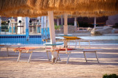 Zdjęcie "Puste leżaki pod słomkowymi parasolami od strony basenu i kosz na śmieci do usuwania śmieci w tropikalnym kurorcie. Wakacje letnie i koncepcja ucieczki" może być wykorzystywane do celów osobistych i komercyjnych zgodnie z warunkami zakupionej licencji Royalty-free. Obraz jest dostępny do pobrania w jakości wysokiej rozdzielczości do 5760x3840.