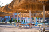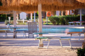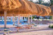 Zdjęcie "Puste leżaki pod słomkowymi parasolami na stronie basenu w tropikalnym kurorcie. Wakacje letnie i koncepcja ucieczki" może być wykorzystywane do celów osobistych i komercyjnych zgodnie z warunkami zakupionej licencji Royalty-free. Obraz jest dostępny do pobrania w jakości wysokiej rozdzielczości do 5760x3840.