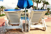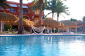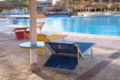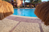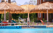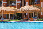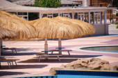 Puste leżaki pod słomkowymi parasolami na stronie basenu w tropikalnym kurorcie. Wakacje letnie i koncepcja ucieczki