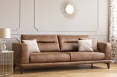 Zdjęcie "Wnętrze salonu z brązową sofą, stołem kawowym, lampą podłogową i rośliną. Dwa zdjęcia na ciepłej, sepia ścianie. Renderowanie 3D. 3D ilustracja." może być wykorzystywane do celów osobistych i komercyjnych zgodnie z warunkami zakupionej licencji Royalty-free. Obraz jest dostępny do pobrania w jakości wysokiej rozdzielczości do 5760x3840.