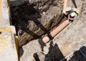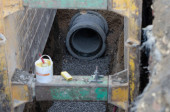 Wstępnie odlewana drogowa jednostka wklęsłej wmontowana w podłoże i podłączona do rury odpływowej gotowej do wrzucenia do betonowej otoczki podczas robót drogowych na placu budowy