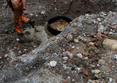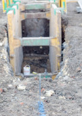 Zdjęcie "Wstępnie odlewana drogowa jednostka wklęsłej wmontowana w podłoże i podłączona do rury odpływowej gotowej do wrzucenia do betonowej otoczki podczas robót drogowych na placu budowy" może być wykorzystywane do celów osobistych i komercyjnych zgodnie z warunkami zakupionej licencji Royalty-free. Obraz jest dostępny do pobrania w jakości wysokiej rozdzielczości do 5760x3840.