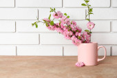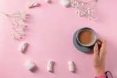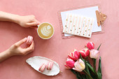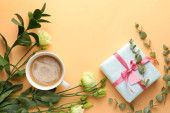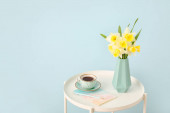 Filiżanka kawy, zeszyty, kwiaty i pączek na tle koloru