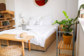 Stylowe wnętrze nowoczesnej sypialni z roślinami