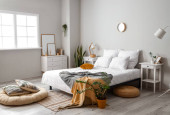 Zdjęcie "Stylowe wnętrze nowoczesnej sypialni z roślinami" może być wykorzystywane do celów osobistych i komercyjnych zgodnie z warunkami zakupionej licencji Royalty-free. Obraz jest dostępny do pobrania w jakości wysokiej rozdzielczości do 5760x3840.