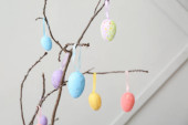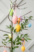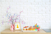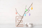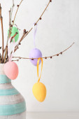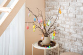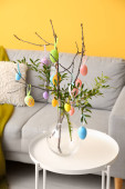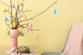 Wazon z gałęziami drzew, różne pisanki na stole i fotel w pobliżu ściany kolor