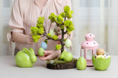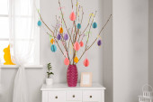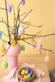 Wazon z gałęziami drzew, różne pisanki na stole i fotel w pobliżu ściany kolor
