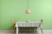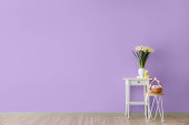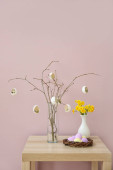 Wazon z gałęzią drzewa i pisanki na drewnianym stołku na ścianie koloru