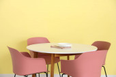 Zdjęcie "Wazon z gałęzią drzewa i pisanki na drewnianym stołku na ścianie koloru" może być wykorzystywane do celów osobistych i komercyjnych zgodnie z warunkami zakupionej licencji Royalty-free. Obraz jest dostępny do pobrania w jakości wysokiej rozdzielczości do 5760x3840.