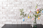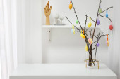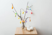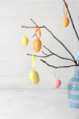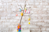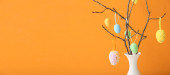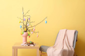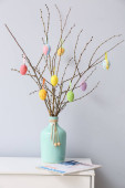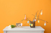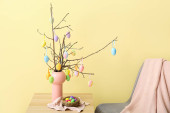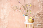 Wazon z gałązką drzewa i różne pisanki na stołku przed ścianą koloru