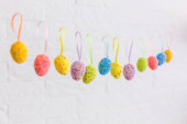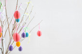 Skład z różnych pisanek wiszących na gałęzi drzewa na tle koloru